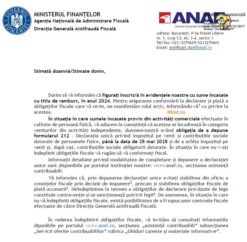 „Stimată doamnă/Stimate domn, Dorim să vă informăm că figurați înscris/ă în evidențele noastre cu sume încasate cu titlu de ramburs, în anul 2024. Pentru asigurarea conformării la declarare și plată a obligațiilor fiscale care vă revin, ne manifestăm rolul activ, informându-vă1 cu privire la acestea.