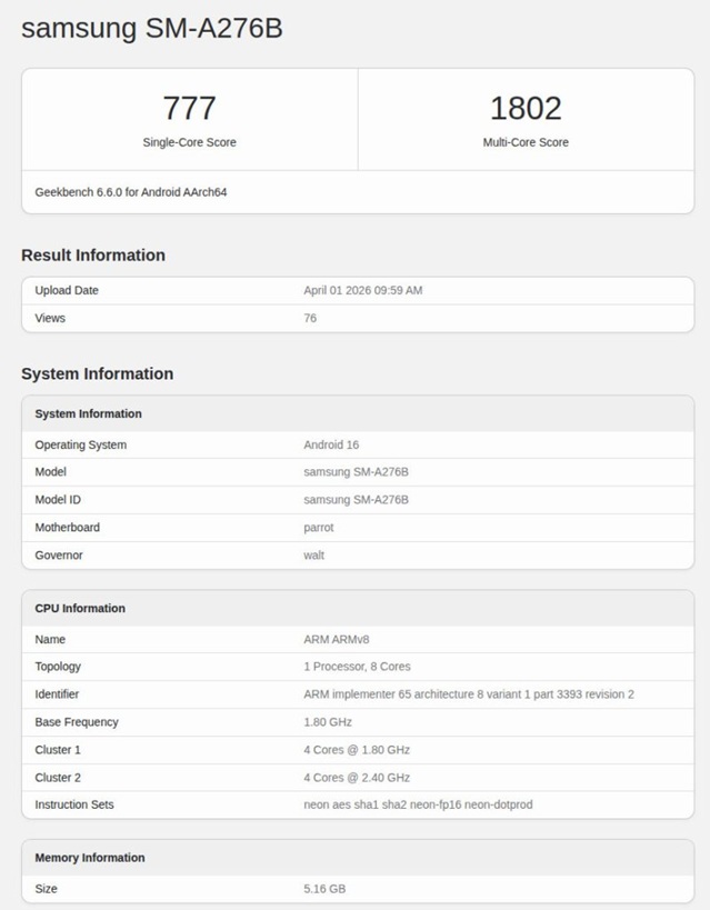 Cei de la Geekbench au dezvaluit specificatiile hardware ale unui nou smartphone Samsung, iar terminalul poarta numele de cod SM-A276B si este vorba despre Galaxy A27 5G.
