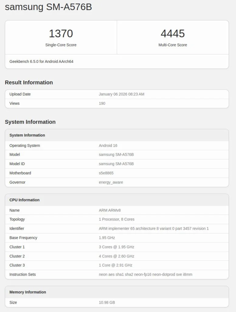Un nou smartphone Samsung si-a facut aparitia in Geekbench, iar terminalul are numele de cod SM-A576B si este vorba despre modelul Galaxy A57 5G.