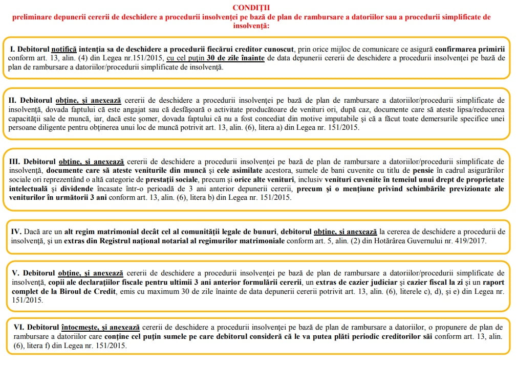 Persoanele fizice care au bunuri sau venituri urmăribile și nu se încadrează pentru procedura pe bază de plan de rambursare, pot opta pentru procedura prin lichidare de active.