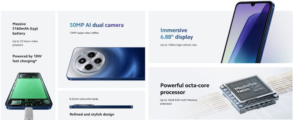Noul smartphone Redmi are un display IPS care masoara 6.88-inci in diagonala si ruleaza la rezolutia de 1600 x 720 pixeli, avand un refresh rate de 120Hz.