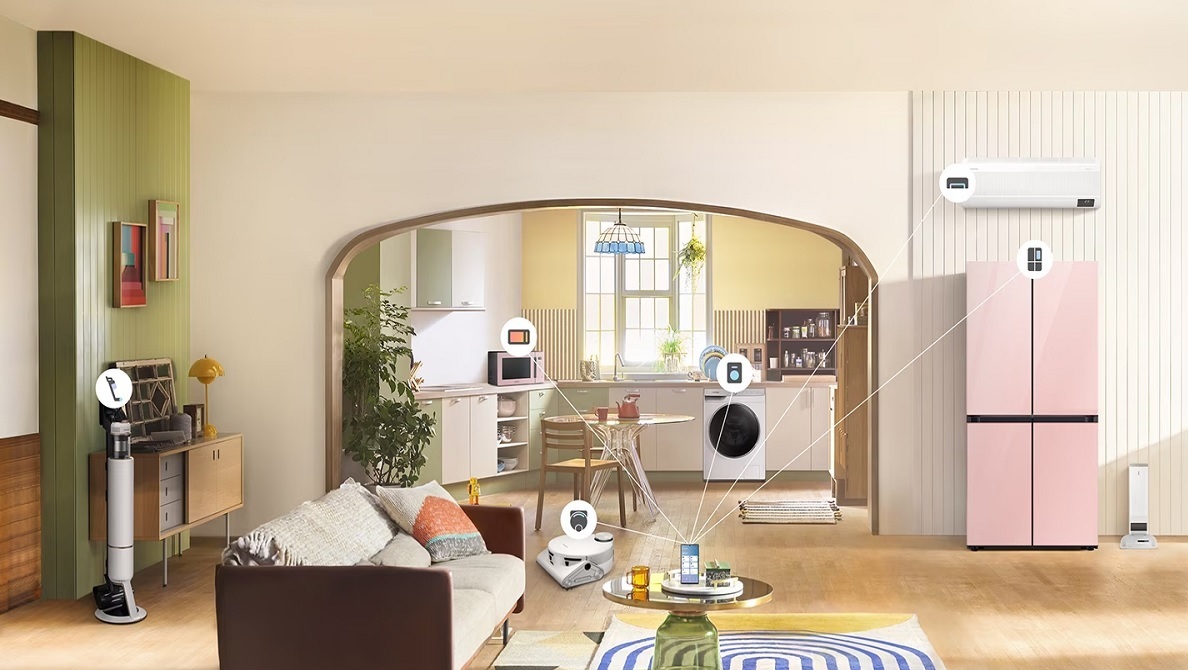 În bucătărie, pentru a completa frigiderele cu Family Hub de 21,5″ și 32″ care sunt disponibile în prezent, Samsung prezintă frigiderul Bespoke cu AI Home de 9″, care se adresează consumatorilor care caută funcțiile avansate ale Family Hub într-o dimensiune mai compactă. Consolidându-și rolul de hub de control, Map View actualizat permite utilizatorilor să selecteze moduri pentru dispozitivele conectate4 cum ar fi aparatul de aer condiționat și aspiratorul robot, și poate fi accesat direct din ecranul de pornire. În plus, AI Home de 9″ funcționează, de asemenea, ca un hub pentru controlul dispozitivelor inteligente terțe care sunt compatibile cu SmartThings, cum ar fi luminile și prizele inteligente. Pe lângă aceste funcționalități, utilizatorii beneficiază de acces transparent la funcții precum SmartThings Energy și opțiuni de divertisment integrate.