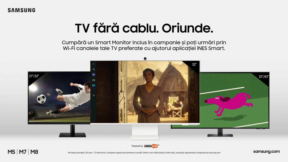 Samsung derulează până la final de an campania „TV fără cablu. Oriunde.” Prin intermediul campaniei, consumatorii care achiziționează un Samsung Smart Monitor din gamele M5 și M7 (modelele 2021) și M5, M7 și M8 (modele 2022) primesc un card cadou ce asigură acces gratuit 30 de zile la serviciul de televiziune online prin aplicație, iNES Live TV.