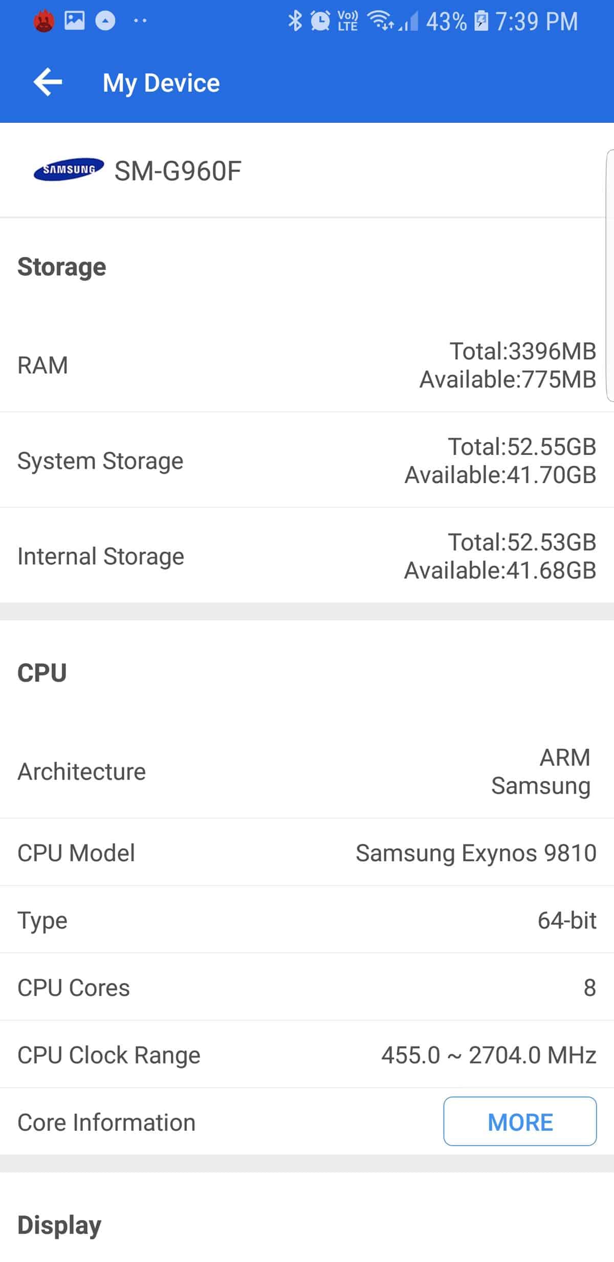 Asa cum am mentionat si anterior, noi am receptionat la test varianta SM-G960F iar aceasta dispune de procesorul octa-core Exynos 9810, GPU ARM Mail-G71/GPU Adreno 630, 4 GB de memorie RAM si 64 de GB spatiu de stocare intern UFS 2.0, care poate fi extins prin intermediul slotului de card microSD.